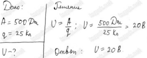 4. Чему равно напряжение на участке цепи, на котором была совершена работа 500 Дж при прохождении заряда 25 Кл?